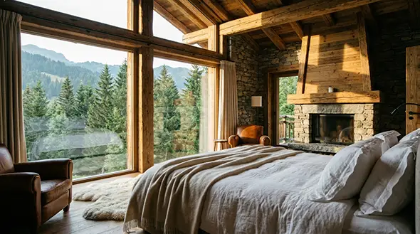 Each chalet is decorated in a modern alpine style using natural materials. The interiors feature a calm colour palette of forest green, grey-blue, earthy brown, and deep burgundy, with plenty of wood, stone, marble, and soft textiles. There is no flashy luxury — only thoughtful comfort and the feeling of a real mountain home. The design was created by renowned studios and artists including Saint-Lazare, Vicky Charles, and Julia Corden.