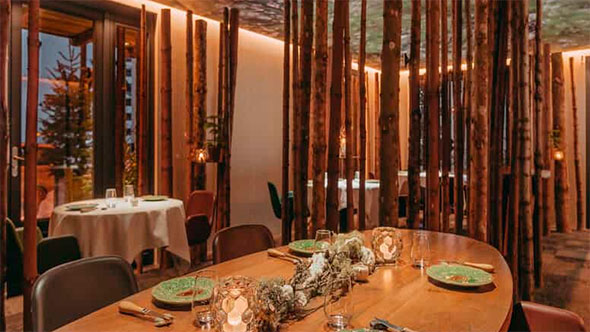 Chef Clément Bouvier draws inspiration from local nature, creating a "forest" presentation and interior. The focus is on wild herbs, farm cheeses, and Alpine fish.