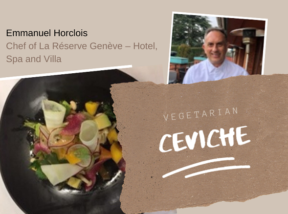 Chop fennel, carrots, radish and beets. Yellow mango and avocado in cubes. First, fry the Chinese mushrooms in oil, then set them on fire (flaming) in sake. Mix all the vegetables in a bowl. Add salt flowers, vegetarian sauce and finely chopped cilantro.