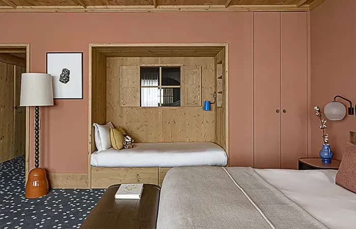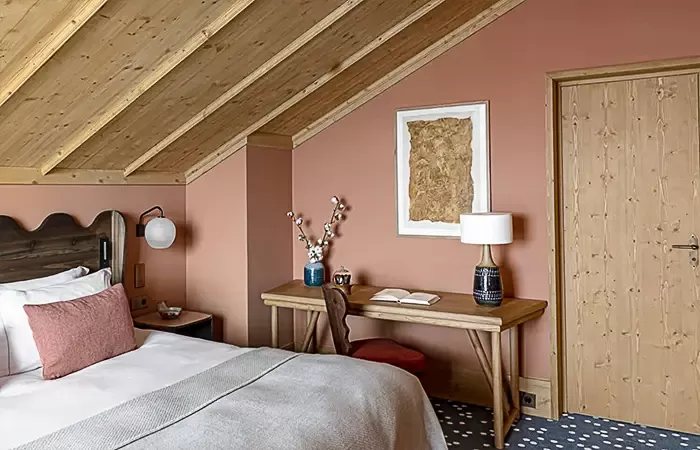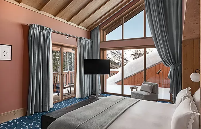 From 30-32 sq m, 1 King size bed, view over the valley, the alpine garden or the slopes, balcony, Wi-Fi, complimentary buffet breakfas, a 100 € food credit per person per day, to be used in our restaurants for dinner only (does not apply to drinks, room service orders, is not cumulative and non-refundable), complimentary soft drinks from private in-room bar, connecting with another room or suite upon request