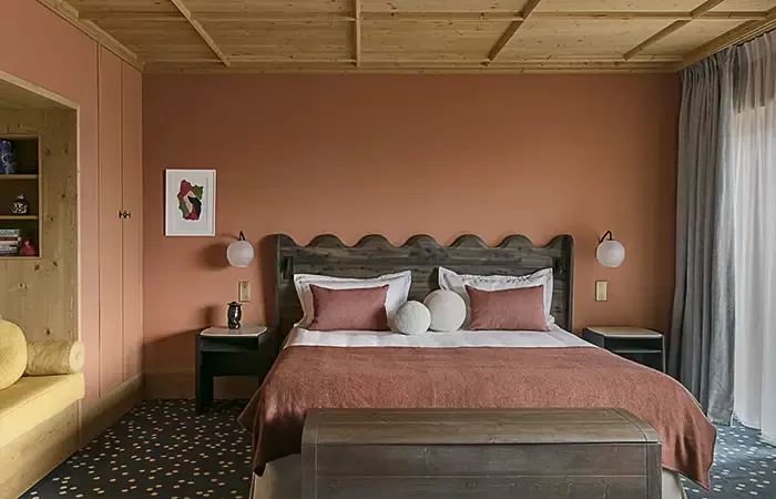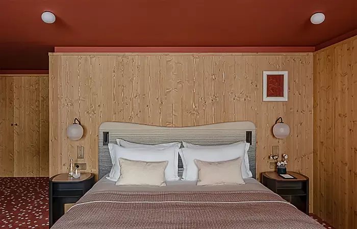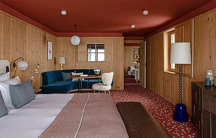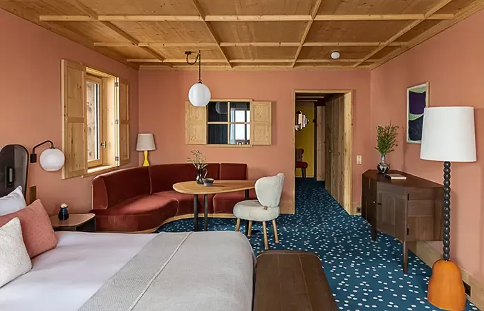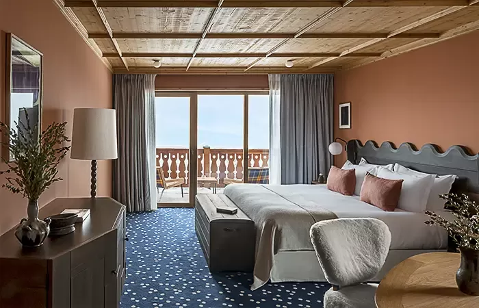 From 35-40 sq m,1 King size bed, view over the valley, the alpine garden or the slopes, balcony, Wi-Fi, complimentary buffet breakfas, a 100 € food credit per person per day, to be used in our restaurants for dinner only (does not apply to drinks, room service orders, is not cumulative and non-refundable), complimentary soft drinks from private in-room bar, connecting with another room or suite upon request
