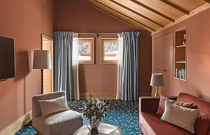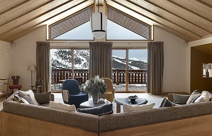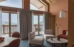 From 52 to 63 sq m, 1 Super King size bed, view over the valley, the alpine garden or the slopes, balcony, seating area, Wi-Fi, complimentary buffet breakfas, a 100 € food credit per person per day, to be used in our restaurants for dinner only (does not apply to drinks, room service orders, is not cumulative and non-refundable), complimentary soft drinks from private in-room bar, connecting with another room or suite upon request, extra bed can be added at an extra cost, upon request and subject to availability